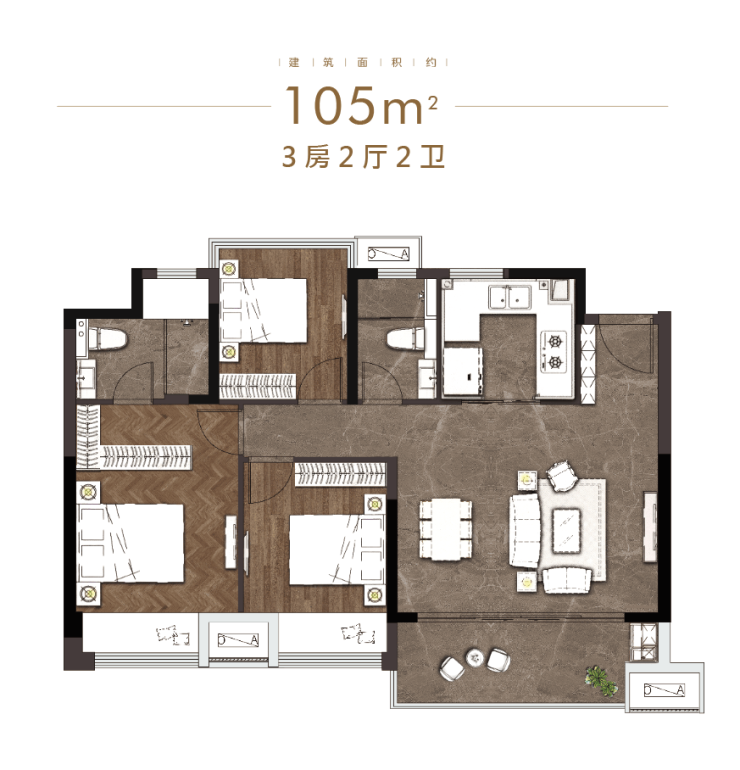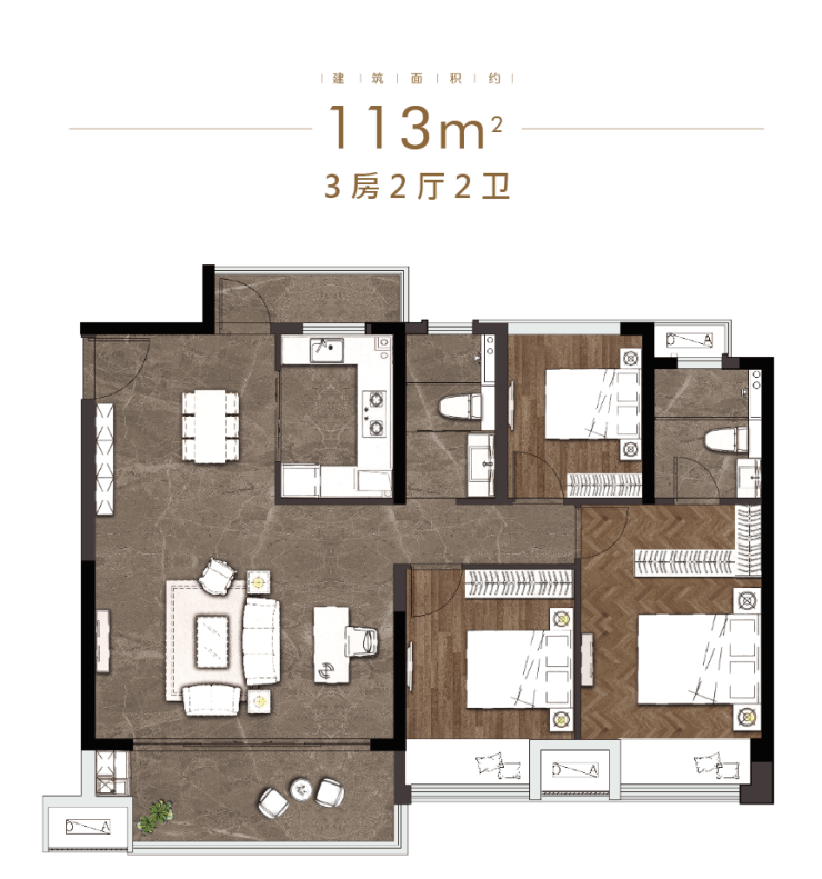 高层:105-113㎡三房两卫(毛坯,横厅设计+主卧套房,单价约9000元/㎡)