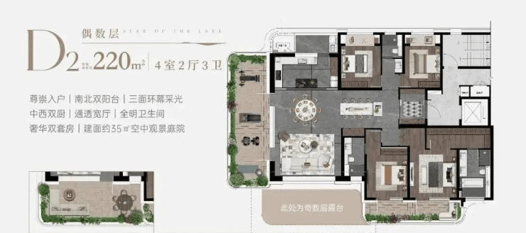 主力户型:建面约150㎡–240㎡滨湖大平层,主打4居、5居空间格局,户型方正,得房率高,户户赠送15–35㎡超大露台(不计入产权面积),可自由改造为空中花园、家庭影院或宠物空间。