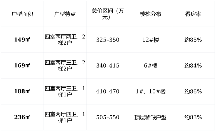 ✅ 温馨提示 : 188㎡1梯1户 户型为项目“明星产品”,剩余房源极少,建议优先锁定南向高楼层;236㎡顶豪户型仅数席,适合追求极致私密与空间的改善家庭。