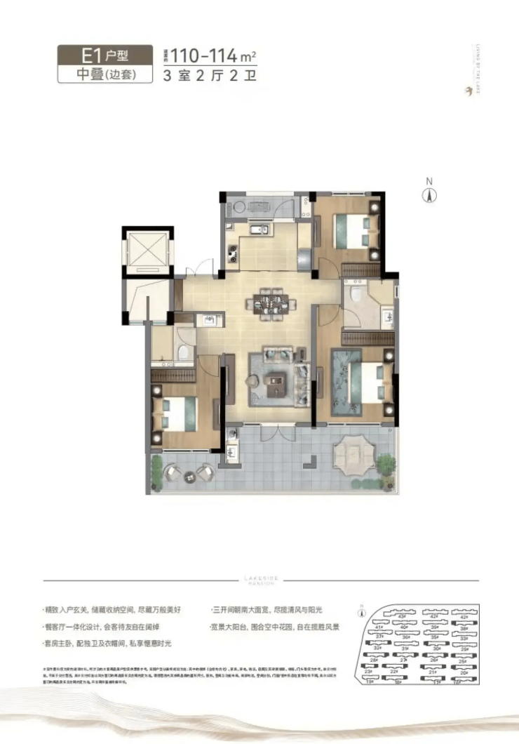 设计亮点:大面宽落地窗、蓝灰色LOW-E玻璃,三开间朝南,南北通透,得房率81-82%。