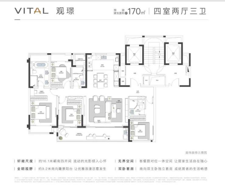 :户型方正,南北通透,采光充足,主卧套房设计,私密性好。