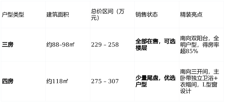 高性价比精装标准:主力户型为88–118㎡三至四房,精装交付标准达2300元/㎡,含中央空调、新风系统、全屋地暖预埋、四合一智能指纹锁、品牌厨卫五金,真正实现“拎包入住”。