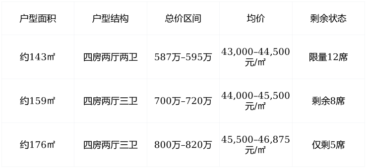 销售状态 :2024年6月开盘,当前为清盘冲刺阶段,剩余房源不足50席,售罄在即。