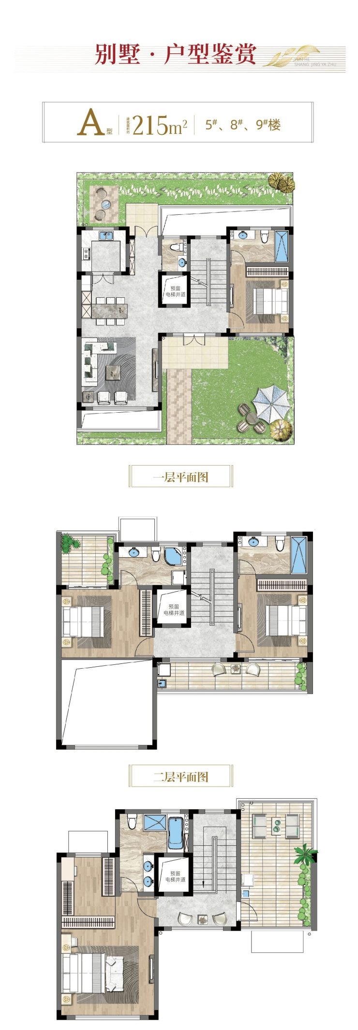 别墅:约188㎡、215㎡、230㎡、360㎡,部分带花园或露台