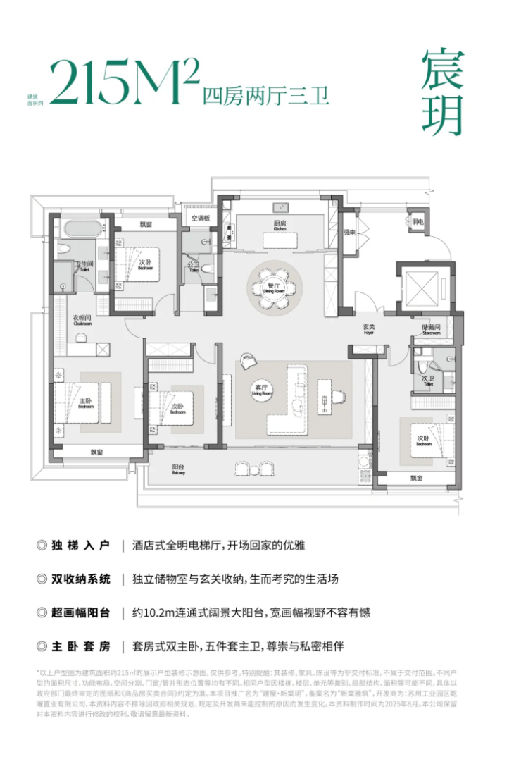 主力户型165–225㎡,全部为四房三卫,南向四面宽设计,客厅面宽达5.4–6.9米,层高3.1米,双套房布局,主卧带独立卫浴+衣帽间,真正实现“空间自由”。