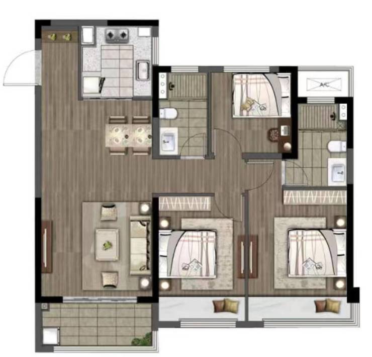95㎡三房两厅一卫:小家庭首选,得房率超82%,南向采光充足;