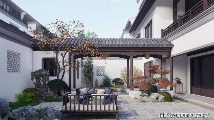 将军门、披檐门、歇山顶、花窗、瓦当、寻杖栏杆等经典中式建筑部件,在此创新演绎,再现中式古韵。