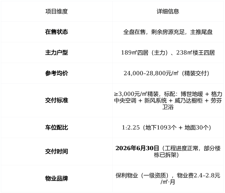央企保利打造的“低密精装改善盘”,以 189㎡-238㎡大户型+准学区+社区商业+高配精装 为核心卖点,2026年6月30日交付,是昆山城东板块少有的“住得下、配得齐、看得见未来”的改善型住宅。