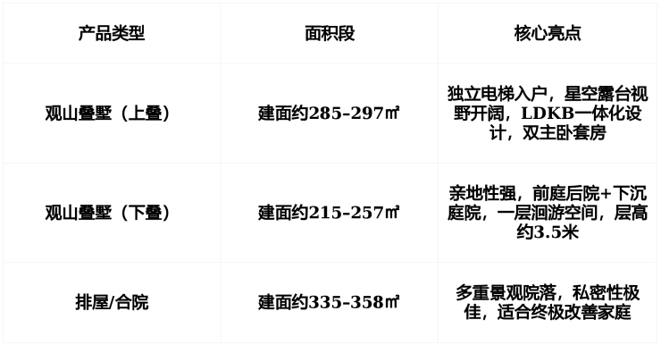 容积率仅约1.1,规划195户(部分资料显示197户)纯低密院墅社区,产品形态涵盖上叠、下叠、联排/合院,圈层纯粹,私密性强。