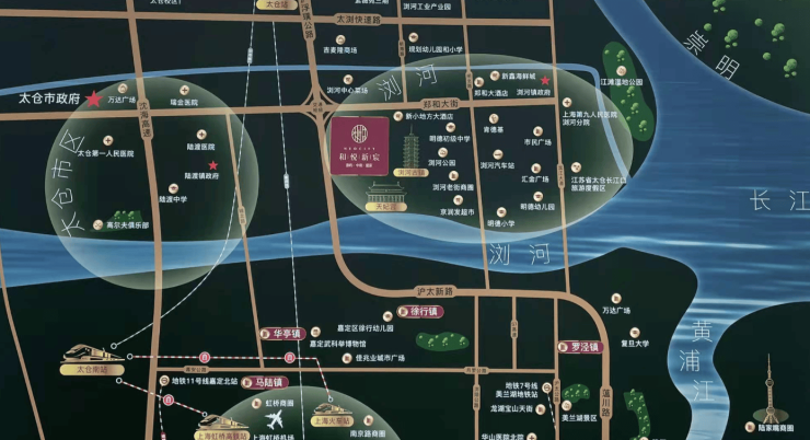 生态景观资源:项目内部规划七重主题园林(形象花园、凝水花园等),结合五维景观设计(现代、自然、沉浸、艺术、隐奢),营造宜游宜赏的园林氛围。外部紧邻浏河古镇(1公里)、浏河公园(2公里)、太仓长江口旅游度假区(3公里),为省级旅游度假区,生态资源丰富。
