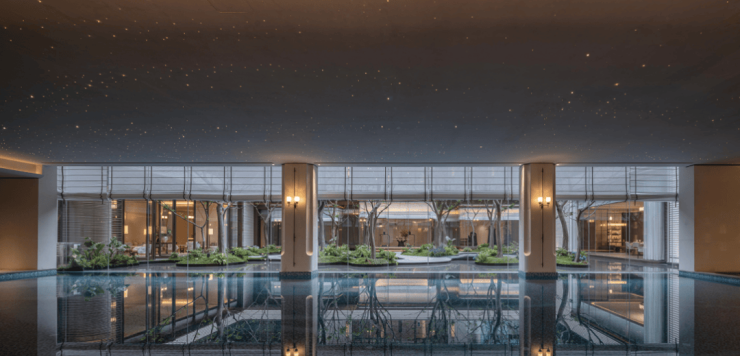 恒温无边泳池与水庭景观无缝衔接,游泳时仿佛畅游于自然之上;行政酒廊、私宴厅、健身房等会所空间,满足社交、宴请、运动等多元需求。