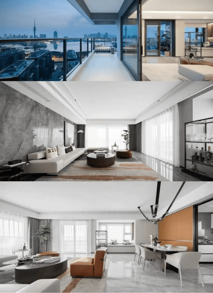 再看户型,约210㎡的户型,在设计之初就完全考虑到了湖景,将客厅部分放在了最东边,客厅区域西侧设有观景飘窗,可以拥有270°的IMAX级观景视野;