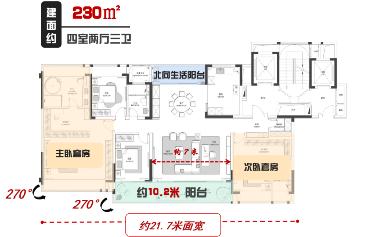 户型设计:社区共 639 户,主力户型为建面约170㎡、197㎡、230㎡的四房大平层,起步面积大,圈层纯粹。户型设计强调大面宽与短进深,如 170㎡户型拥有约 6.6 米大宽厅和约 9.8 米双联阳台,230㎡户型更是定义了塔尖生活的空间尺度。