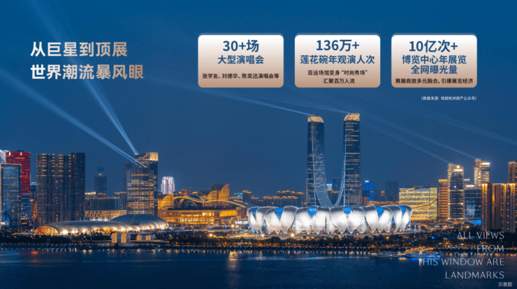 更难得的是,这里不仅有江景,更有城市地标的全景盛宴:对望钱江新城“日月同辉”(杭州大剧院与国际会议中心),俯瞰奥体“大小莲花碗”(亚运会主体育场与网球中心),远眺西湖吴山诗意轮廓,城市中轴线尽收眼底。