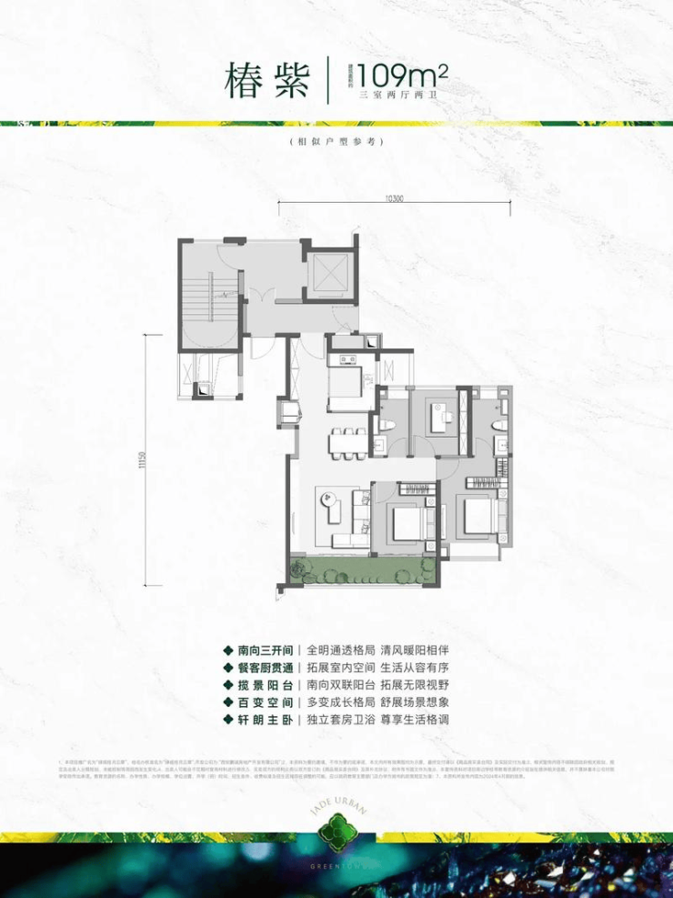 建面约110–119㎡:三至四室,四开间朝南,大方厅设计,采光通风优越