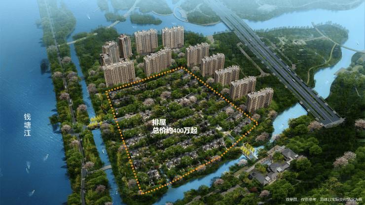 园区规划纯粹江境排屋,总规划户数275户,钱塘江岸稀有的一线江景纯低密社区