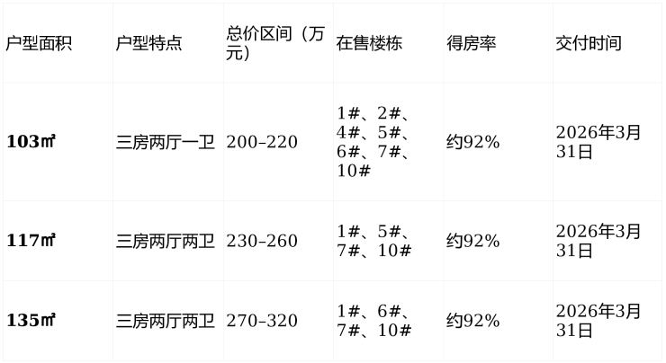 温馨提示 :目前 103–117㎡主力户型仍有余量 ,适合年轻家庭;135㎡为改善首选,建议尽快锁定。
