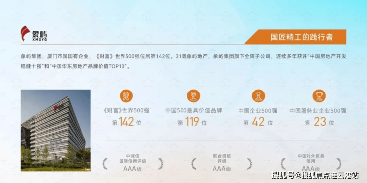 象屿集团,厦门市属国有企业,《财富》世界500强位居第142位。31载象屿地产,象屿集团旗下全资子公司,深耕长三角核心都市圈,享誉华东区域的精品住宅开发商,连续多年获评“中国房地产开发稳健十强”和“中国华东房地产品牌价值TOP10”。