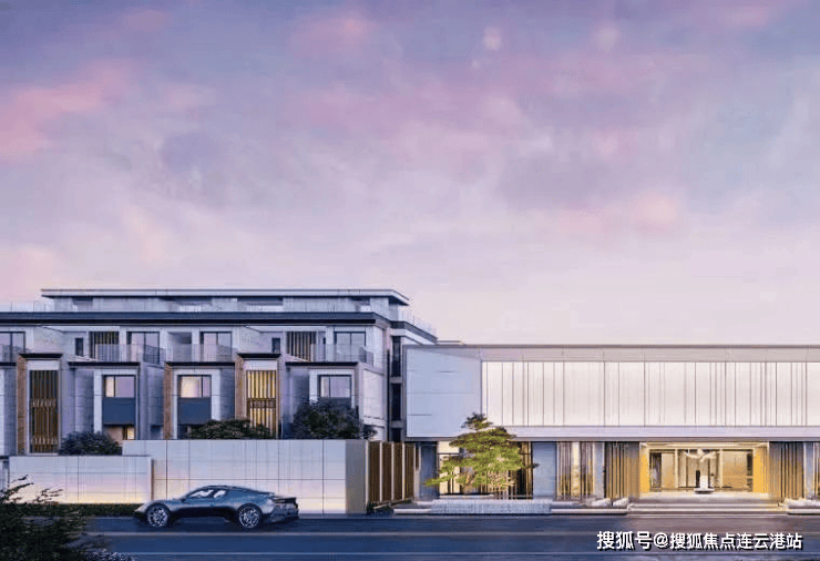 现代江南风格立面,大面积玻璃幕墙+石材干挂,打造“四水归堂”中式园林