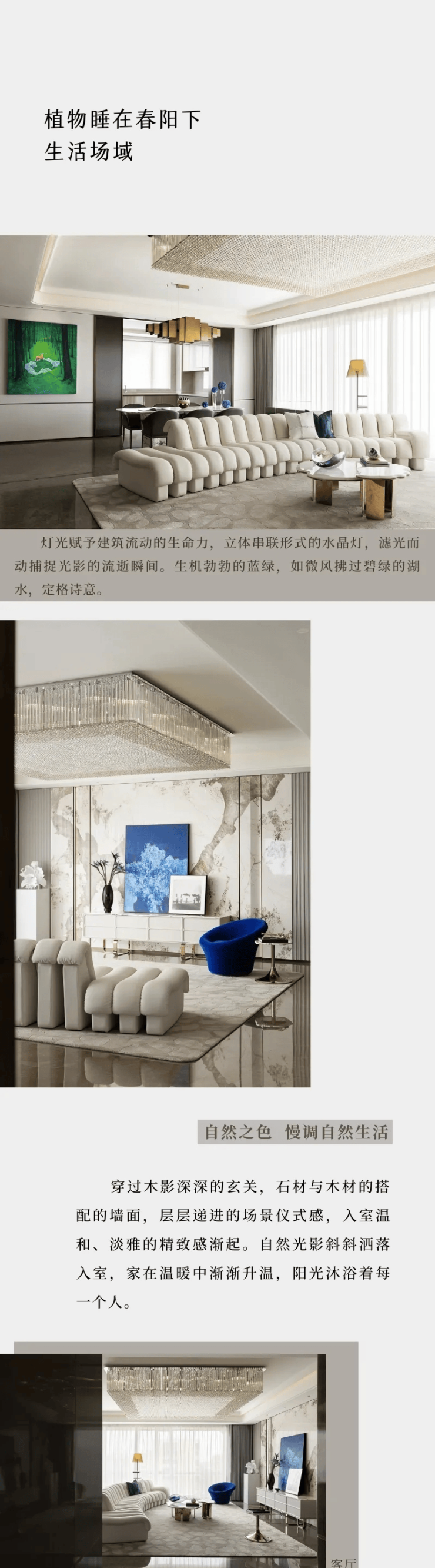 呈现了精致奢华的一面。展示中心内以纯色带来空间的静谧和纯粹,进退有度的建筑线条搭配几何灯光,时空恍若在凝固中流动,墙面石材特有的质感和地面遥相呼应形成了简约的高级感。