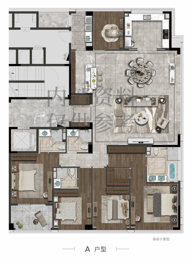 320m²做了3个户型3种风格任选,四房和五房满足不同的需求,得房率78%,大方厅的尺度极其阔绰,宽U型的厨房非常明亮。围合原生因此户型可以做得很出彩。