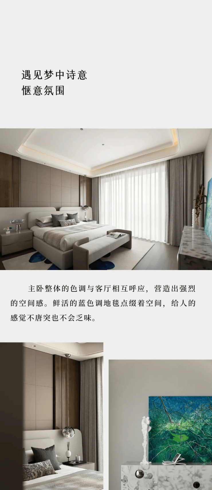 再来看色调。320方样板间整体以米白、金色为主色系,但在装饰和摆件的选择上,又以蓝色和绿色点缀其中。这样的选择反而从千篇一律的设计风格中跳脱出来,成为点睛之笔。