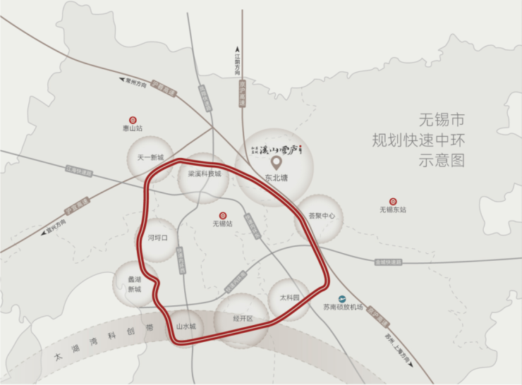 【交通】:地理位置优越,咫尺中环线,速达梁溪科技城、蠡湖新城、天一新城等热门板块,紧邻无锡枢纽、锡虞立交,靠近京沪高速、锡山区主干道东亭北路,东亭北路向南驾车可快速到达东亭商圈,东亭北路往西沿锡虞路便捷通达主城区,沿东亭北路往南可快速到达太湖大道高架。项目临近无锡站、无锡东站、苏南硕放国际机场,速通苏州、南京、上海。