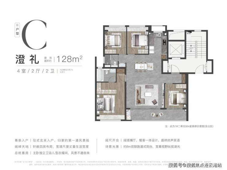 建面约 128㎡四室两厅两卫:总价 430 万起,位于 9 幢,四开间朝南,约 6.8 米宽厅搭配景观阳台,主卧配备独立衣帽间与卫浴,诠释奢适生活。