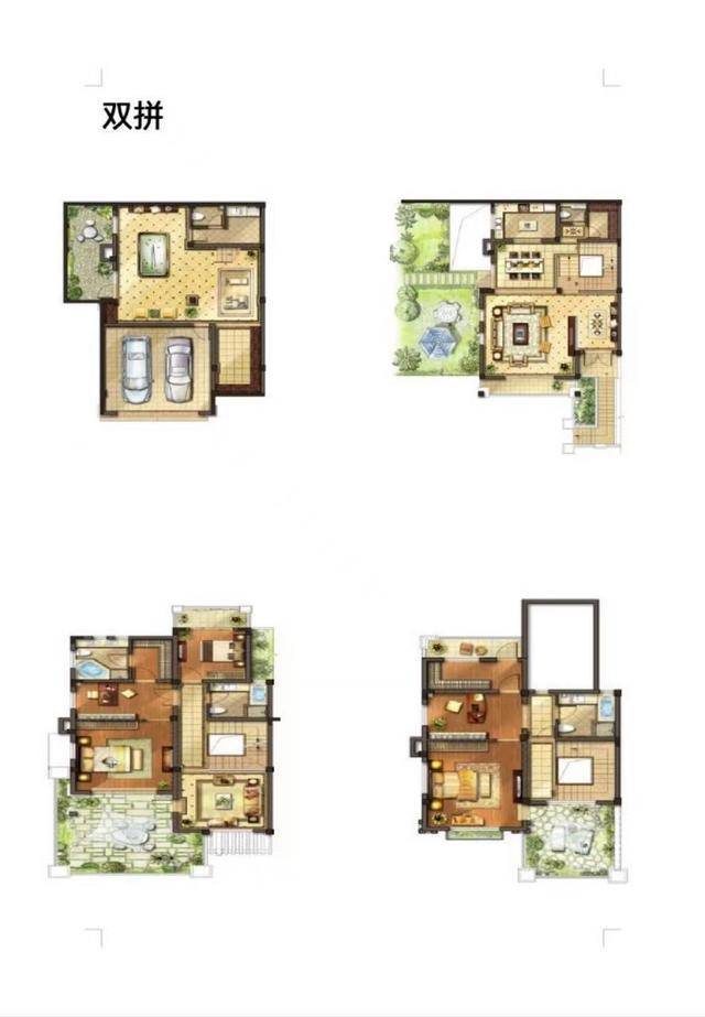 双拼别墅:建面358-536㎡,五开间朝南布局,配置星空露台与阳光地下室