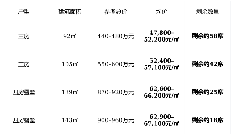 主力户型:92㎡三房、105㎡三房、139–143㎡四房叠墅,覆盖首改至终极改善全周期;