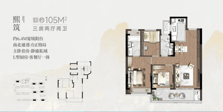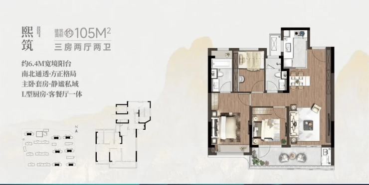 105㎡三房两卫:全明格局,户型方正,南向设计,采光通风俱佳,套内面积77.24㎡,总价290-300万