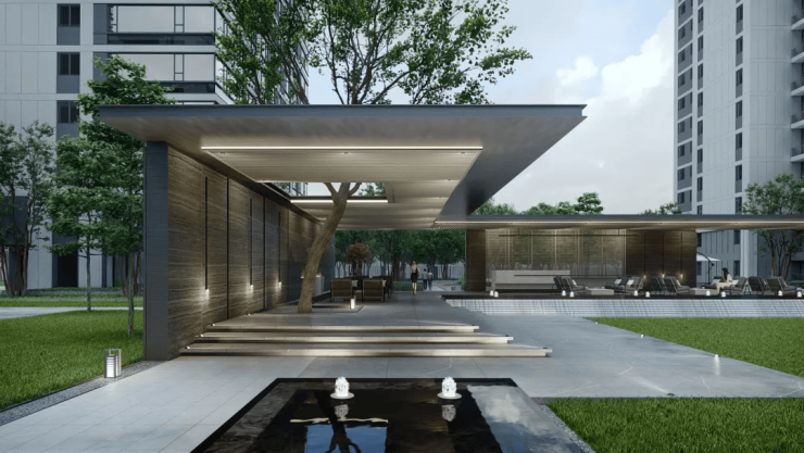 公建化外立面:石材+金属铝板+Low-E玻璃,质感媲美一线城市豪宅