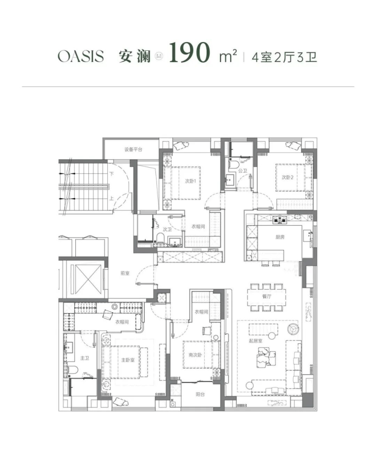 190㎡ 四室两厅三卫:大横厅+三面采光,顶层复式接近300㎡,稀缺性强
