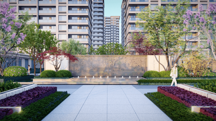 建筑之外,项目以“一环两轴多节点”的原则布局打造园区公区景观,用400m运动跑步道成环,而东西尊享归家轴和南北自然绿轴为两轴,同时规划爱享家、in花园、童梦国、颐养园、酷能站、缤纷谷、森林氧吧七大景观空间节点;