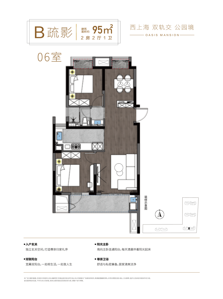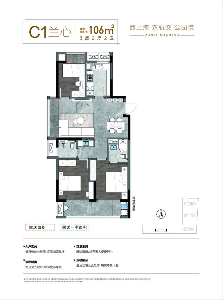 户型小而精,刚需友好 :85㎡两房实现双卧、双卫、独立厨房,106㎡三房餐客一体+阳台连通,空间利用率高,适合沪漂青年、新婚家庭。