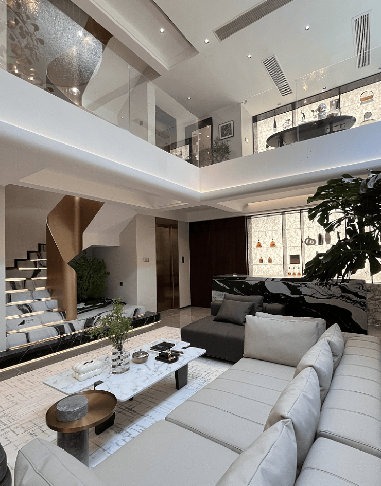 新中式风格,实体围墙+格栅设计,地下双层挑空(层高5.3-5.75米)