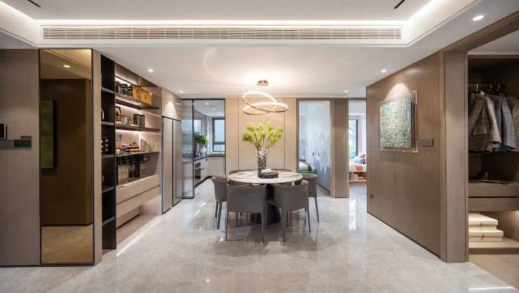 边厅设计实现了LDK一体化,将客厅、餐厅、厨房动线融合,形成超尺度全景家庭聚厅,大大提高了家人成员之间的沟通互动。