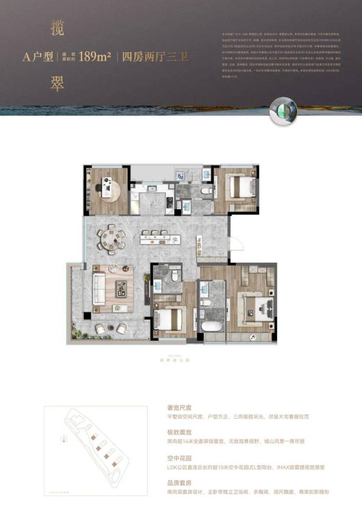 主力户型建面139-189㎡,均为四居室,南向面宽达14米,主卧配置独立衣帽间及飘窗,部分户型实现三面采光