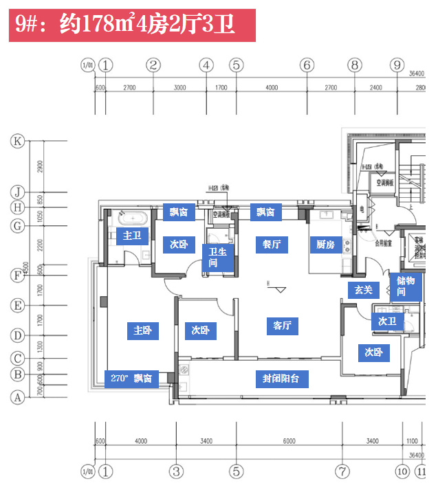 约178㎡:四房三卫,南向面宽达17.4米,主卧配270°L型飘窗,部分户型可享河景