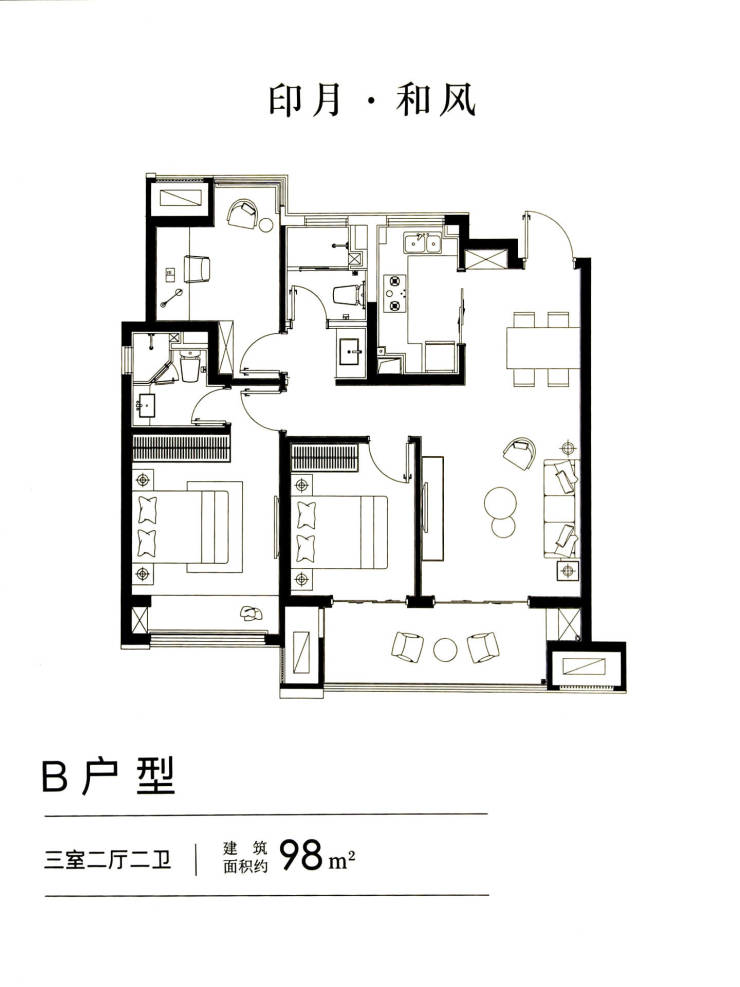 95㎡三房一卫:南北通透,客厅开间3.6米,主卧飘窗拓展使用空间,U型厨房与干湿分离卫生间满足小家庭需求。 适合年轻夫妇或三口之家,空间利用率高。