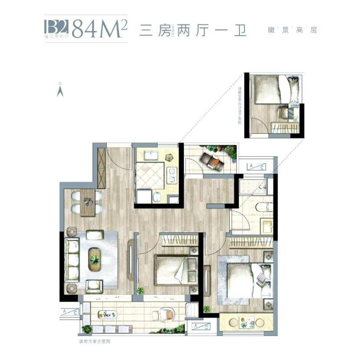 恒力健康城还提供了约84㎡的三房两厅一卫(高层)户型,这一设计同样展现了空间的高效利用。其三开间朝南的布局,配合约5米的南向双阳台,不仅保证了充足的采光,还为居住者带来了更为宽敞舒适的生活体验。