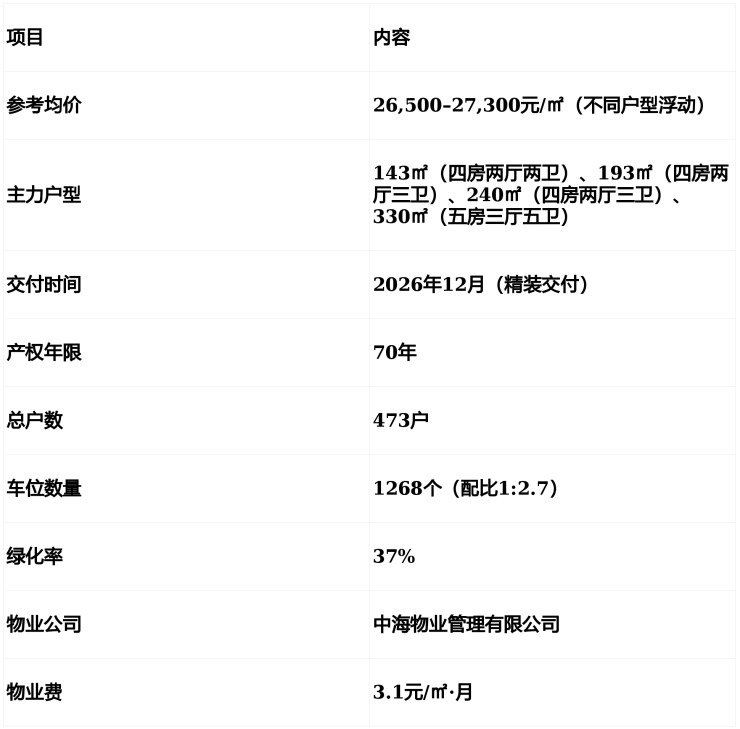 物业由中海物业(全国TOP级物管)入驻,物业费3.1元/㎡·月,服务标准高于区域均值 。