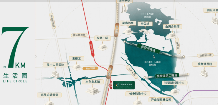 路网体系:北接郭巷大桥,10min接入独墅湖隧道,15min直达金鸡湖商圈;南连通达路,贯通尹山湖与吴中城区,无缝衔接中环西线。