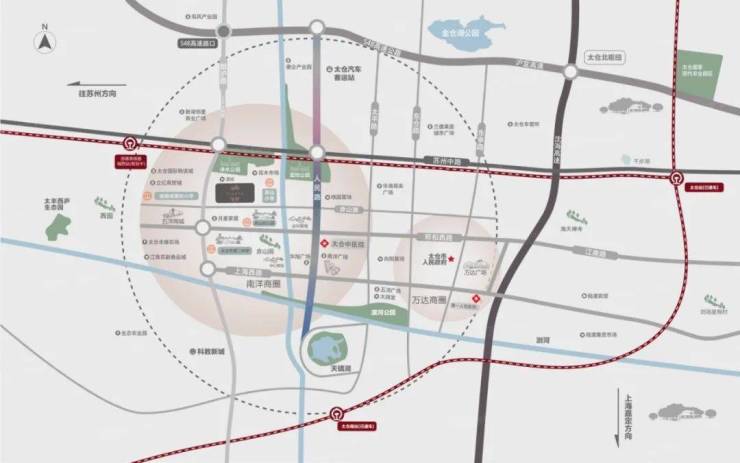公路网络:西侧沪宜公路向南无缝对接上海,直达沪通高铁"太仓南站";向北直达沪宜高速双凤收费站,畅达省内各大城市;向东直达沪通高铁"太仓站"