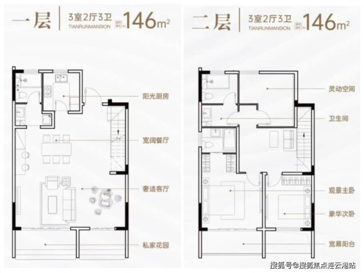 主力户型:建面约146-147㎡叠墅(分上叠/下叠),上叠配私家电梯+顶层露台,下叠赠送150㎡独立花园+25㎡露台
