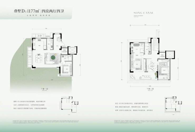 宋风院墅(叠墅):建面136–176㎡,下叠带花园、中叠平墅、上叠带露台,私梯入户,地下空间可改酒窖/书房