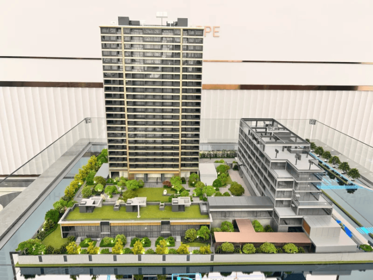 外立面材质:采用四面铝板+全景玻璃幕墙,并点缀定制香槟金线条与天然奢石,整体质感媲美8万+/㎡的顶豪项目