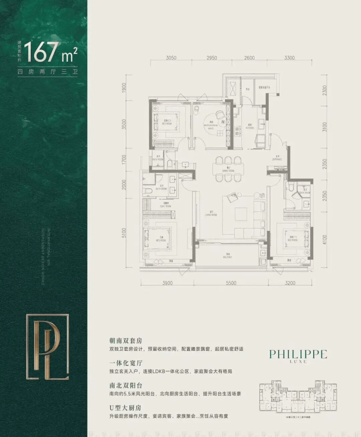 特点:南厅横厅设计,5.5米开间客厅,主卧3.9米开间带皮革硬包背景墙,次卧亦可升级为独立套房,适合三代同堂或高端改善家庭