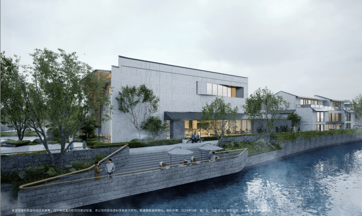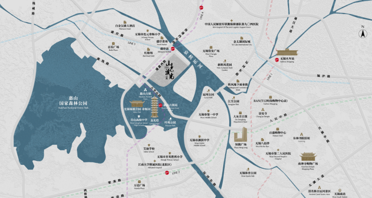 核心资源:项目依梁溪河源头(惠山泉)而建,300米南北景观轴复刻寄畅园造园手法,打造人工水系+叠瀑+曲桥+古亭