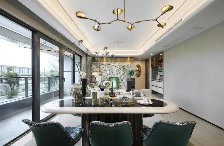 架空层采用围合式布局,配置绿色水磨石卡座、吧台及休闲沙发,层高不低于3.65米